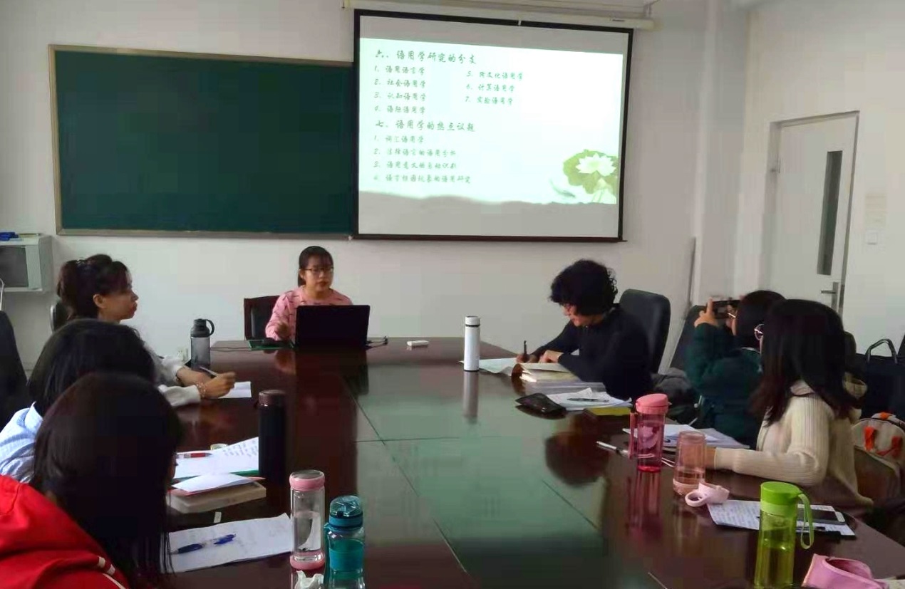 12月20日上午,在盛乐校区公司楼A315教室语言学与应用语言学学位点举行了“语言学经典文献读书会”。李秀教授、麻彩霞博士及本学位点的10位硕士研究生参加了活动。同学们分享了自己读书的感想并与老师进行了学术交流,本次活动取得了圆满成功。