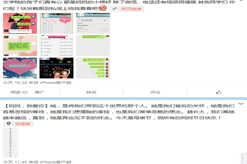 5月10日,公司员工自行发起“妈妈,我爱你”母亲节活动,员工们以微信、电话、做视频等方式向母亲表达了自己的祝福。“内蒙古师大EMC易倍体育团总支”官方微博进行了全程跟踪并发布了活动进展情况