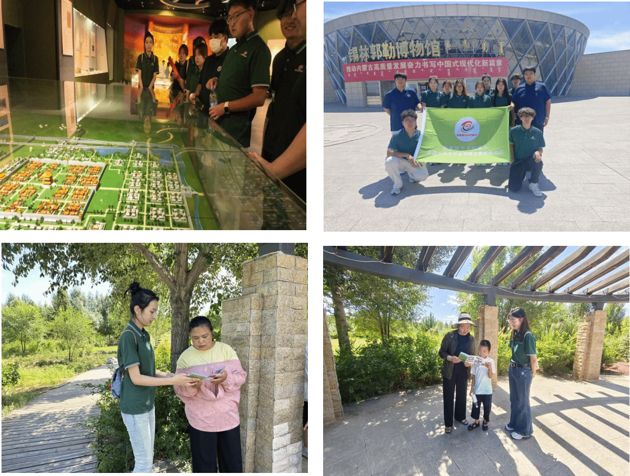 8月2日下午,“文韵传声”实践队来到锡林郭勒博物馆、生态植物园等地面向博物馆服务人员、生态植物园工作人员和游客开展推普活动。在锡林浩特博物馆,队员们向博物馆讲解员、窗口服务人员、馆内游客详细了解了他们普通话使用情况和水平,并同步开展了普通话推广和宣传活动。锡林浩特博物馆丰富的馆藏,特别是有关语言文字演变发展的部分藏品,让大家得以近距离感受中华民族语言文字一脉相承的演化脉络,深刻领略中华民族语言文字跨越千年的独特魅力。随后,队员们来到锡林浩特生态植物园,与园区工作人员、游客互动,向他们普及普通话知识,队员们也在园区的参观和实践中切身感受了党的十八大以来锡林郭勒盟在防沙治沙、草原生态保护等生态文明建设方面取得的非凡成就。
