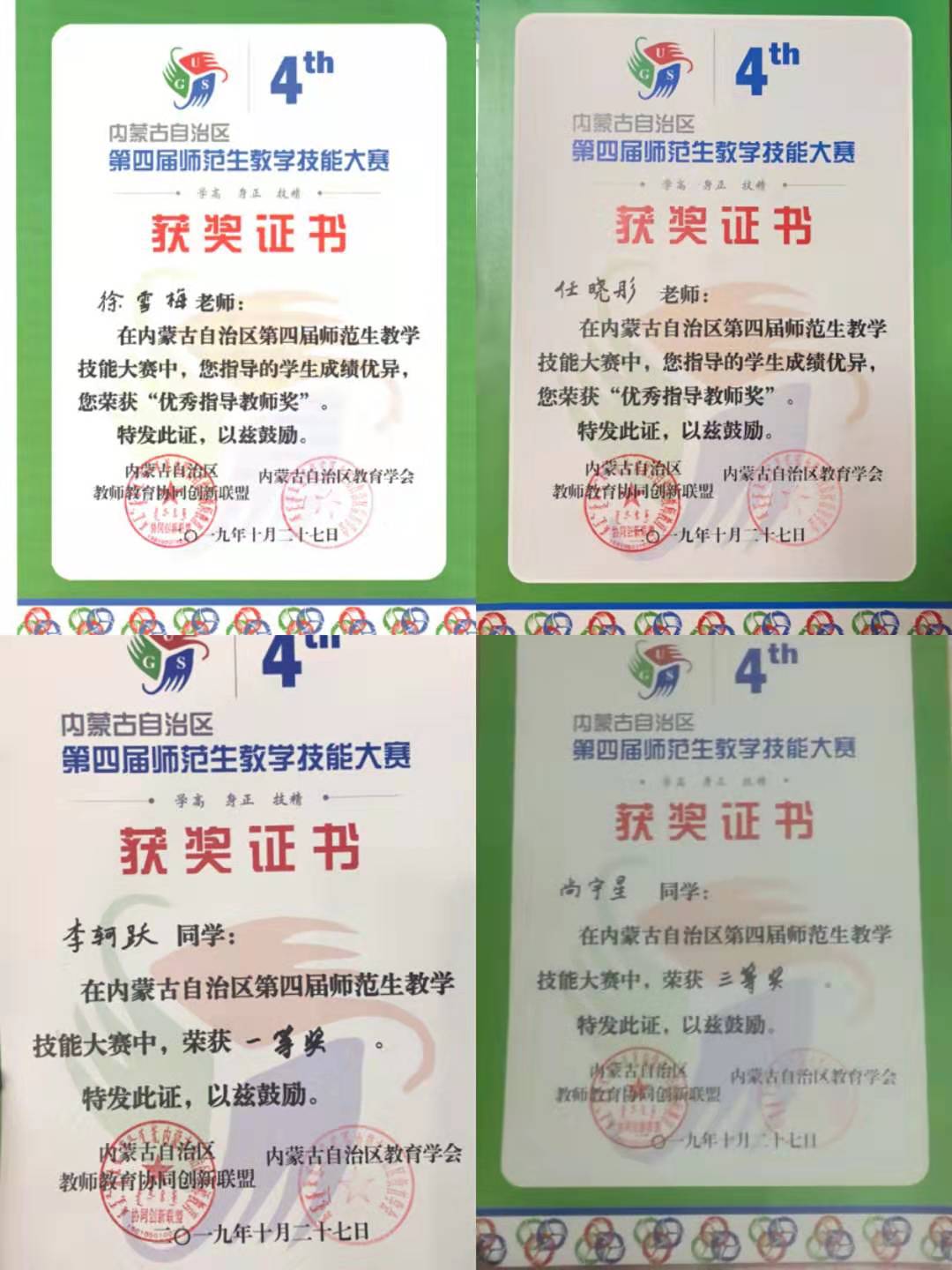 2019年10月25日至28日,由内蒙古自治区教师教育协同创新联盟和内蒙古自治区教育学会共同主办的内蒙古自治区第四届师范生教学技能大赛在内蒙古民族大学举行。来自全区六所高校的14名选手展开了激烈角逐,公司李轲跃同学荣获汉语言文学(汉语)组一等奖,尚宇星同学获三等奖。指导教师任晓彤、徐雪梅荣获“优秀指导教师奖”。