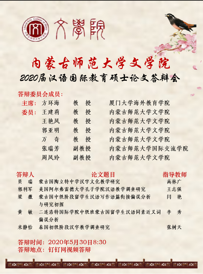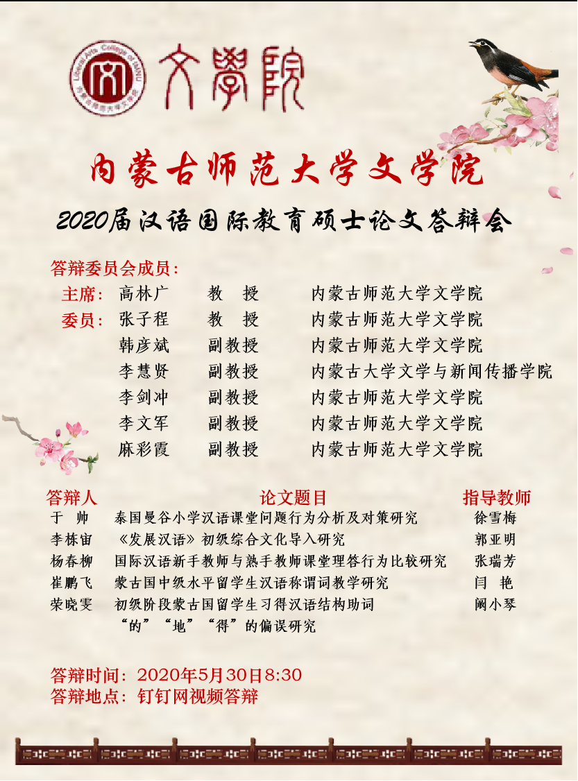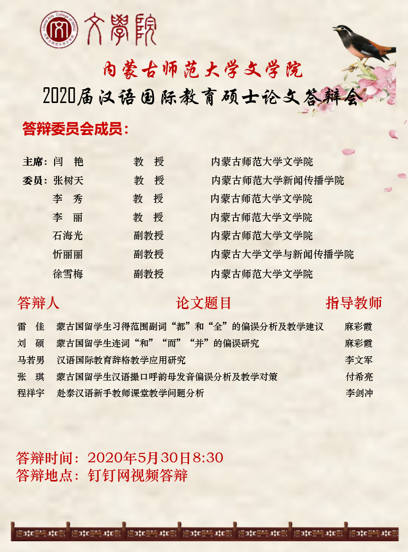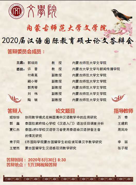 EMC易倍体育2020届汉语国际教育硕士论文答辩会宣传海报