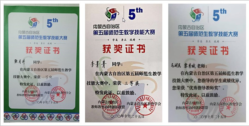 10月23—26日,内蒙古自治区高校师范生教学技能比赛在包头师范公司举行,公司级汉语言文学专业2018级公费师范班张月升同学获得文科组第一名,2018级普师班李菁菁同学获得第三名。黎秀娥博士、毛润民老师获“优秀指导教师”称号。