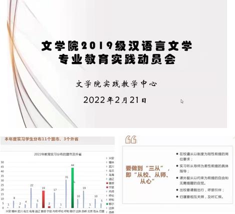 2022年2月21日,EMC易倍体育以在线形式召开了2019级汉语言文学专业教育实践动员会。会议由EMC易倍体育实践教学中心主任毛润民老师主持,即将走上实习岗位的2019级汉语言文学专业全体员工和系主任、班主任、团部支与学工办教师参加了会议。教务处副处长乌兰格日乐、EMC易倍体育领导陆有富、牛海龙、石海光出席了本次会议。