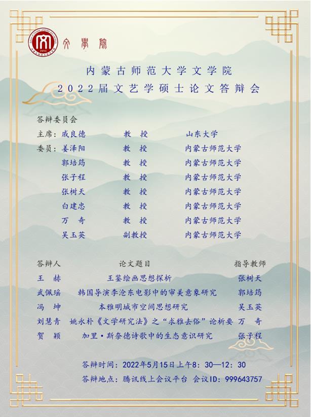 文艺学专业定于2022年5月15日上午(8:30—12:30)召开2022届硕士学位论文答辩会。根据《关于做好2022年上半年博士、硕士研究生学位授予工作的通知》《关于做好疫情防控期间2022届研究生毕业答辩工作的通知》的要求,本次答辩采用的方式为网络视频答辩,使用的远程会议软件为腾讯会议,会议号为999643757。本次答辩会特别邀请了山东大学儒学高等研究院教授、博士生导师戚良德担任答辩主席。欢迎广大师生参加交流。