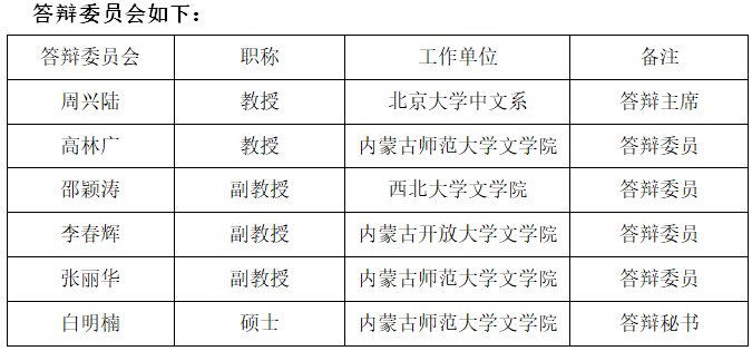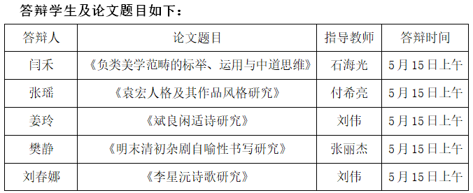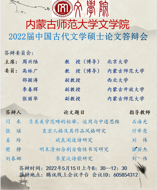 中国古代文学专业定于2022年5月15日上午(8:30-12:30)召开2022届硕士学位论文答辩会。根据公司《关于做好2022年上半年博士、硕士研究生学位授予工作的通知》《关于做好疫情防控期间2022届研究生毕业答辩工作的通知》的要求,本次答辩采用的方式为网络视频答辩,使用的远程会议软件为腾讯会议,会议号为(会议号为:605-854-312)。本次答辩会特别邀请了北京大学中文系教授、博士生导师周兴陆担任答辩主席。欢迎广大师生参加交流!