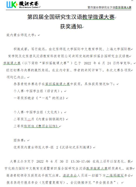 自2021年9月大赛启动以来,校领导、院领导高度重视此项工作。公司组织2020级汉硕进行了初赛,并组建了由内蒙古大学赵金色、丁艳,EMC易倍官方网站国际交流公司陈金香,以及本院任晓彤、胡素莲、白海燕、李瑞春、刘婕、阿婧斯、王伟超等共十位老师组成的专业指导团队。团队分一个“个人赛小组”和两个“团体赛小组”,指导教师在教学内容、教学环节,教学方法、课件制作、视频拍摄、后期处理等各个环节给予参赛选手以专业指导。最终,选送团体参赛作品2个和个人参赛作品10个参加本届全国研究生汉语教学微课大赛。