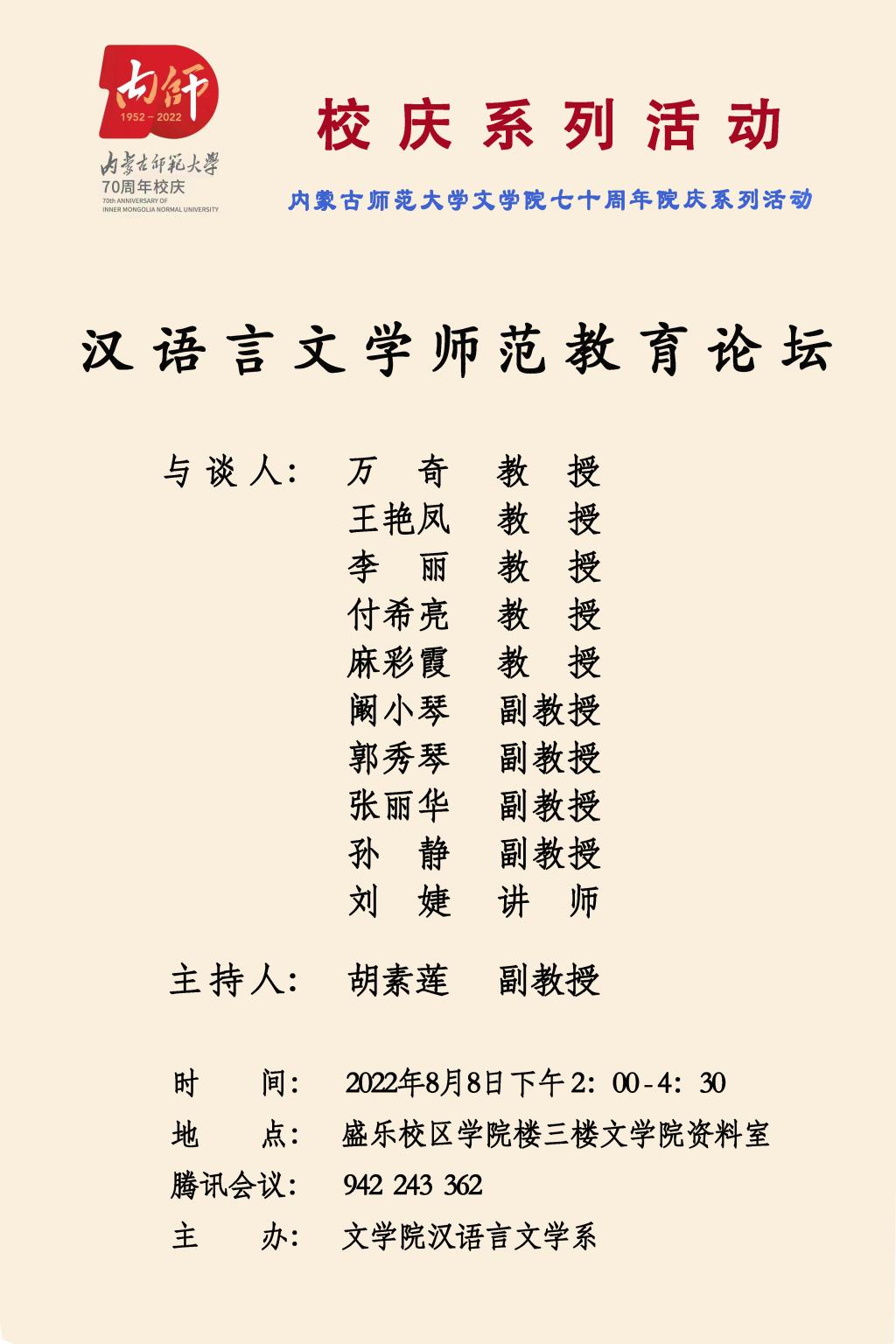 为纪念EMC易倍官方网站七十华诞、EMC易倍体育建院(系)七十周年,在2022年8月8日下午,汉语言文学系在盛乐校区举办了“汉语言文学师范教育论坛”。论坛在线上线下同时进行。