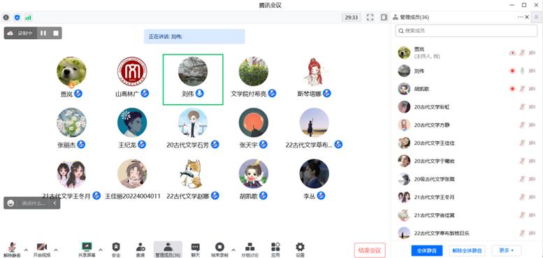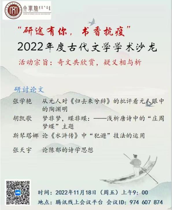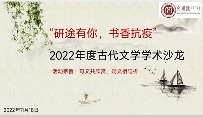 独学而无友,则孤陋而寡闻。勤学而交流,则博学而睿智。2022年11月18日上午,公司中国古代文学学位点成功举办了主题为“研途有你,书香抗疫”的2022年度古代文学学术沙龙。古代文学硕士点的高林广、陆有富、石海光、付希亮、刘伟、张丽杰6位导师和高国庆、赵玉龙、马奥远等古代文学课教师以及学位点的全体研究生共40余名师生参加了本次学术沙龙活动。受新冠疫情影响,本次学术沙龙采取线上方式进行。