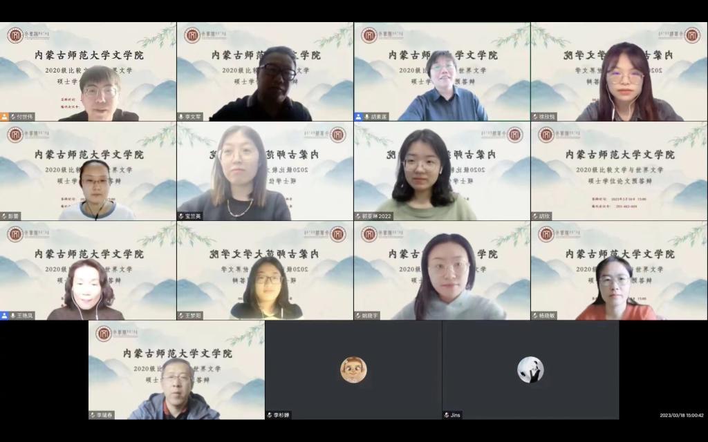 2023年3月18日下午,EMC易倍体育比较文学与世界文学专业2020级硕士研究生预答辩以腾讯会议的方式在线上成功举行。比较文学与世界文学方向的导师王艳凤教授,马晓华教授,李文军副教授,杨晓敏教授,李杉婵副教授,李瑞春副教授,胡素莲副教授,阿婧斯老师及本专业20级、21级、22级研究生参加了预答辩。预答辩由王艳凤教授主持。比较文学与世界文学专业20级的徐欣悦、彭蕾、王梦阳3位同学依次对论文进行陈述,分别阐述了论文的研究对象、研究方法、框架、内容和创新之处等。各位导师对每位研究生的论文进行了深入、细致的点评,并提出了相关的修改意见。本次预答辩的成功举行既展示了比较文学与世界文学专业20级员工三年来的学习成果,也体现了本学位点务实、严谨的学术风气。
