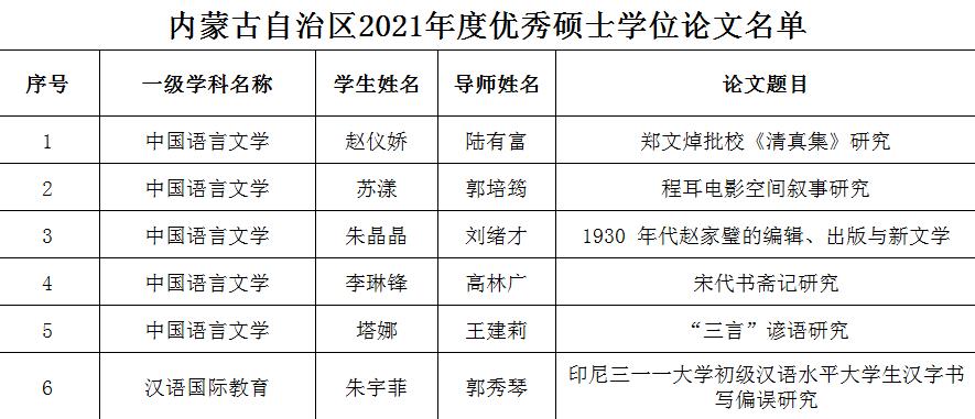 近日,自治区教育厅公布了2021年度自治区优秀博士、硕士学位论文评选结果,公司《宋代书斋记研究》等6篇硕士学位论文被评为2021年度内蒙古自治区优秀学位论文,其中中国语言文学5篇,汉语国际教育1篇。本次全区共评选出137篇优秀硕士学位论文,公司共有26篇论文被评为自治区优秀研究生学位论文。
