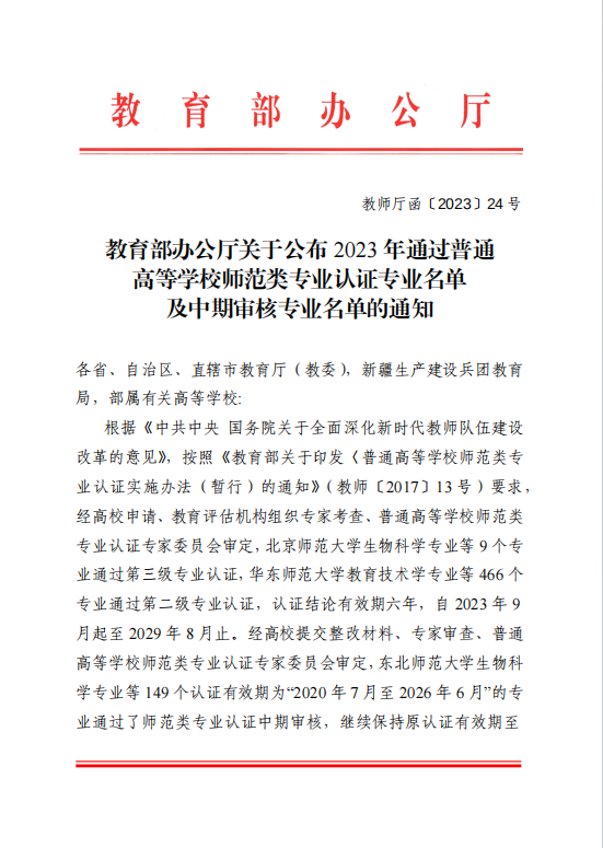根据《中共中央 国务院关于全面深化新时代教师队伍建设改革的意见》,按照《教育部关于印发<普通高等公司师范类专业认证实施办法(暂行)的通知>》(教师〔2017〕13号)要求,公司汉语言文学专业申请了普通高等公司师范类专业第二级认证。经教育评估机构组织专家考察,普通高等公司师范类专业认证委员会审定,公司汉语言文学专业通过第二级专业认证,认证结论有效期六年,自2023年9月起至2029年8月止。