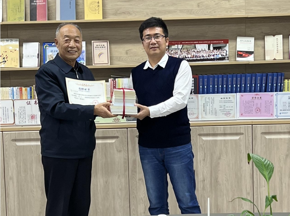 捐赠仪式上,郭仁昭员工向母校捐赠了自己在一线工作近六十年的丰硕成果,其中包括专著《辞格简话》《辞格》《诗歌欣赏》,还有业余创作的诗集《原上草》、文集《芳草地》、戏剧集《梨花苑》等。陆有富经理向郭仁昭员工颁发了捐赠证书。