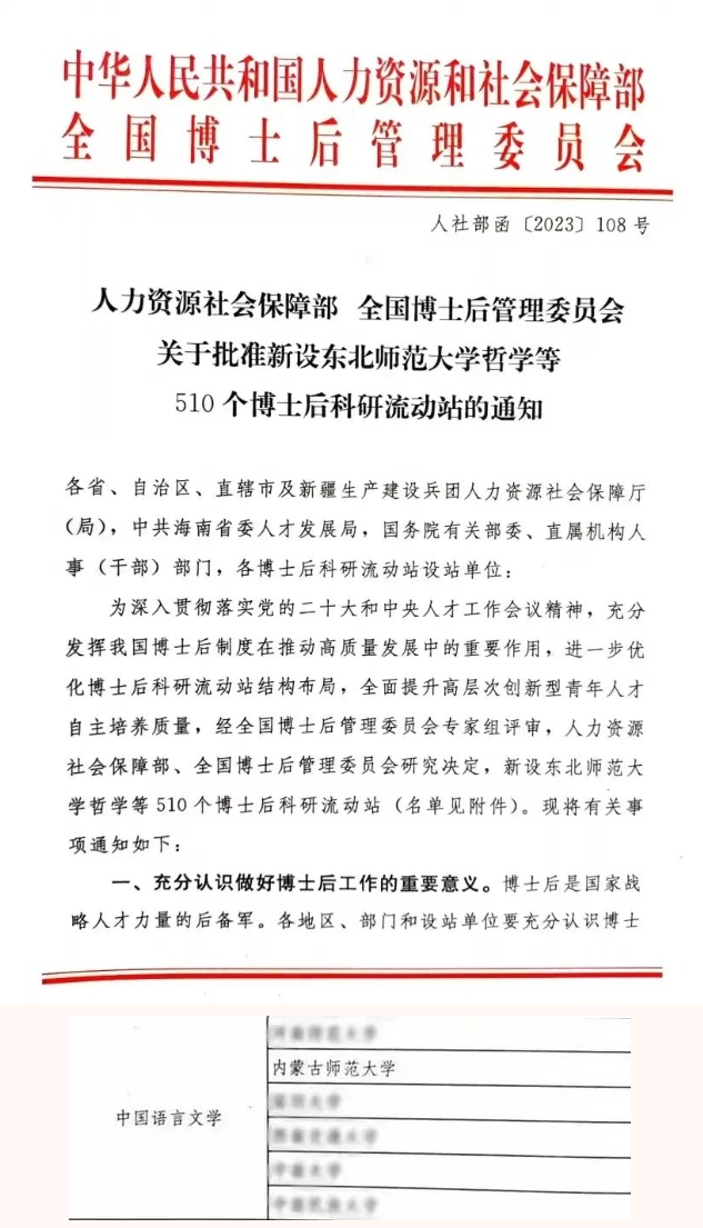 日前,国家人力资源和社会保障部、全国博士后管理委员会正式发布《关于批准设立东北师范大学哲学等510个博士后科研流动站的通知》(人社部函〔2023〕108号),公布了2023年批准新设博士后科研流动站名单。其中,EMC易倍官方网站获批新增中国语言文学博士后科研流动站。至此,公司在中国语言文学学科已全面建成本—硕—博—博士后贯通的完整人才培养体系