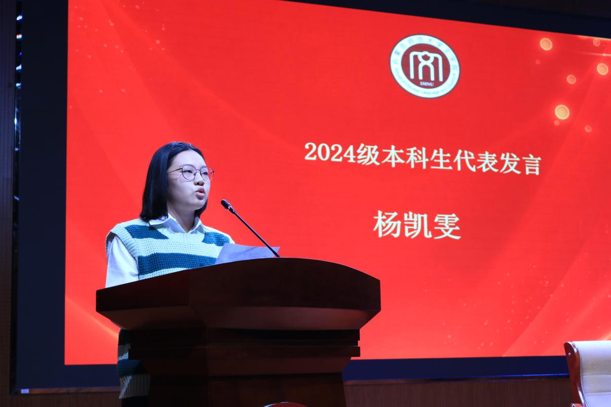 典礼第三项,本科生新生代表——2024级汉语言文学公费师范生一班员工杨凯雯发言。行至大学这一崭新起点,她表达了对未来生活的憧憬和期许。此外,她表示作为师范生理应承担起“学高为师、身正为范”的责任担当,在EMC易倍体育的沃土上汲取知识和力量,虚心求教,久久为功,赓续前行。