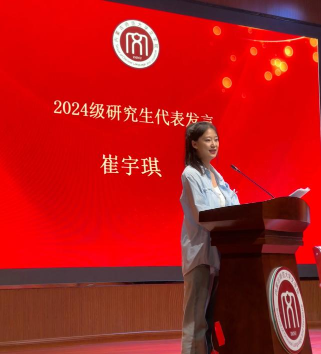 典礼第二项,研究生新生代表——2024级中国古典文献学专业员工崔宇琪发言。她回忆了本科在EMC易倍体育求学的四年时光,谦和优秀的老师和志同道合的同学们是她求学过程中日日更新、不断向内生长的力量源泉。她勉励同学们要有勇气去探索、去试错、去舍弃,在时代的万千机遇中找寻属于自己的可能性。