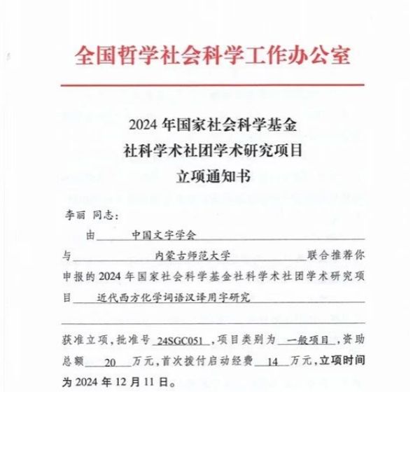 公司李丽教授主持申报的“近代西方化学词语汉译用字研究”获批2024年国家社会科学基金社科学术社团学术研究项目。