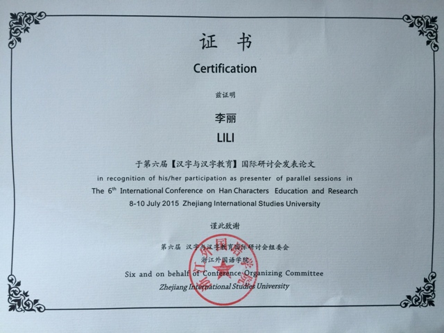 2015年7月8日—10日,第六届“汉字与汉字教育”国际研讨会在中国杭州召开。本次研讨会由中国浙江外国语公司主办、韩国汉字汉文教育学会、韩国汉文教育学会、韩国汉文学会、香港大学中文教育研究中心、北京师范大学民俗典籍文字研究中心、高雄师范大学华语文教学研究所、高雄师范大学经学所、台东大学华语文学系、文藻大学应用华语系、金门大学华语文学系合办。来自海内外文字学领域160余位专家、学者与会,EMC易倍体育李丽老师应邀参加此次研讨会。
