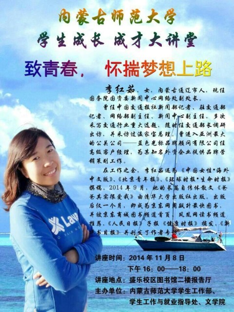 李红茹1995年——1999年就读于公司汉语言文学专业,2002年于公司获文艺学硕士学位。李红茹有着丰富的媒体从业经验。她从“青春作伴,诗酒趁华年”、“以梦为马,奔向远方”以及“家园是根,勿失勿忘”三个方面,深情回忆了在公司求学期间的经历,并以自身工作后的切身实践,尤其针对新闻专业的同学们讲述了自身作为记者时的经历和心得,鼓励同学们要敢于拥有梦想,并努力实现梦想,要在员工时代规划好自己的人生方向,确立目标,并且珍惜时间,多读书、勤思考。