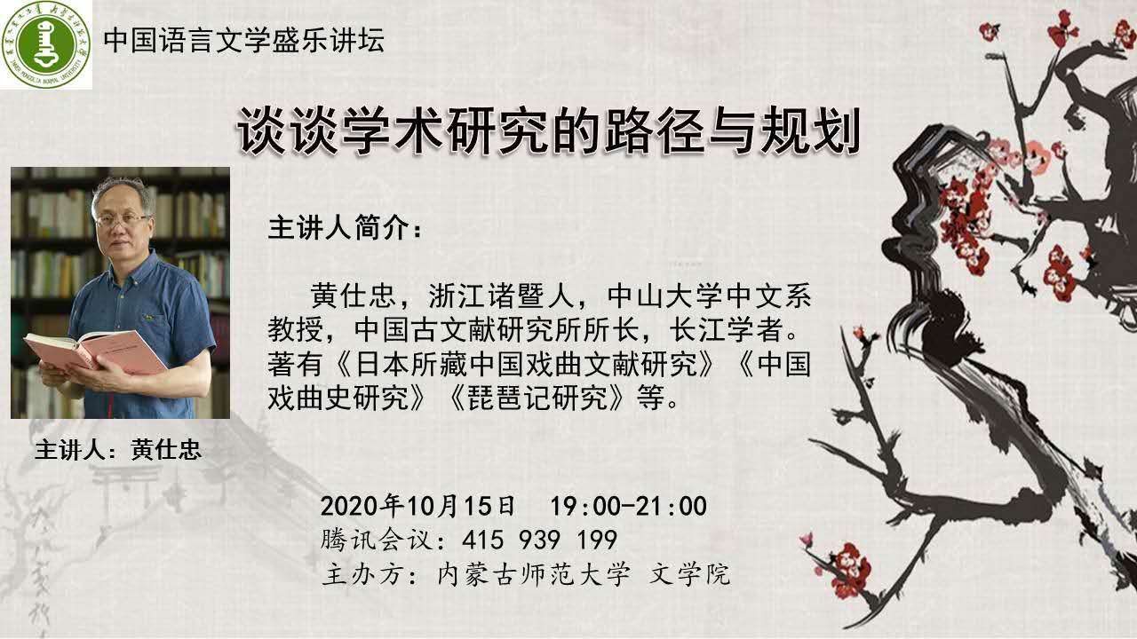 2020年10月15日,EMC易倍体育“中国语言文学盛乐讲坛”继续开讲。受公司邀请,中山大学中文系教授、中国古文献研究所所长、长江学者黄仕忠教授为公司师生作了题为“谈谈学术研究的路径与规划”的学术讲座。本场讲座由闫艳经理主持,中国古代文学学位点承办,采取线上视频方式进行,公司120多名师生聆听了讲座。