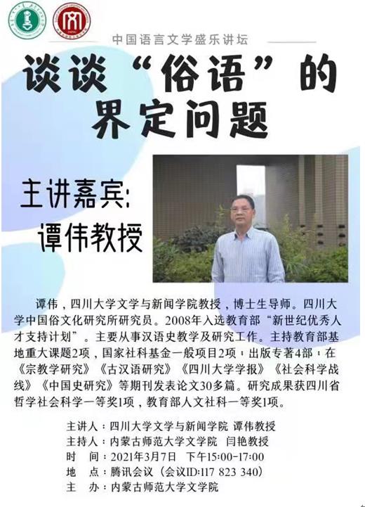 2021年3月7日下午,四川大学文学与新闻公司谭伟教授为公司师生作了题为《谈谈“俗语”的界定问题》的精彩讲座。本场讲座由公司经理闫艳教授主持,采取线上方式进行,公司相关专业50余名师生共同聆听了本次讲座。