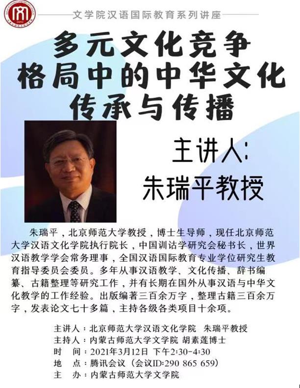 2021年3月12日,北京师范大学汉语文化公司执行经理、中国训诂学研究会秘书长、世界汉语教学学会常务理事、全国汉语国际教育硕士专业学位教指委委员朱瑞平教授应邀为公司师生作了题为“多元文化竞争格局中的中华文化传承与传播”的精彩学术讲座。本次讲座采用腾讯会议形式进行,由公司胡素莲博士主持,汉语国际教育、学科教学(语文)、语言学及应用语言学等专业的50余名师生聆听了讲座。