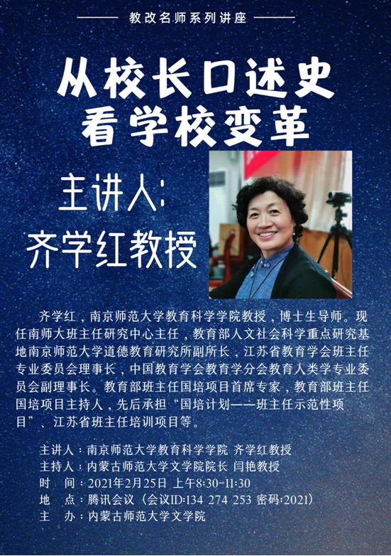 2月21日,2月25日和3月2日上午,南京师范大学教育公司齐学红教授陆续在线上为特岗培训学员作了3个场次的精彩讲座。会议由闫艳经理主持,特岗培训学员、公司硕士研究生以及部分教师共130余人聆听了讲座。
