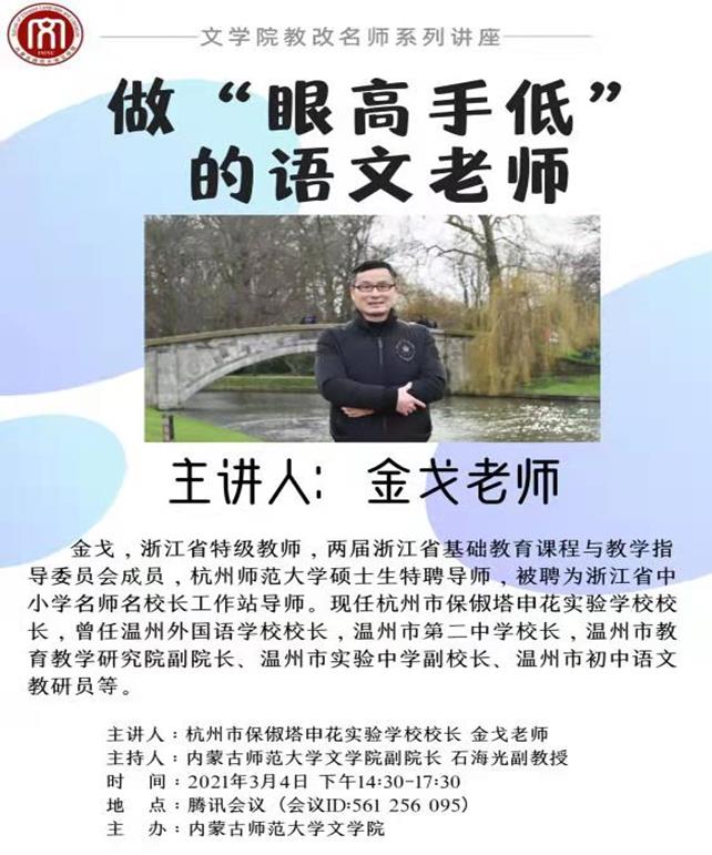 金戈董事长是杭州市的特级教师,两届浙江省基础教育课程与教学指导委员会成员,杭州师范大学的硕士研究生特聘导师。他从语文老师站位要高、谋划要高、布局要高的“眼高”着手,分析作为教师的基本素养。金戈董事长强调,语文教师一定要有远大抱负、开阔视野、顶层设计的“宏观”视角;也要有遵循教学规律、遵循员工成长规律、遵循教育生态的“中观”观念,同时也要有慎重对待每一堂课、每一句话、每一个字的“微观”态度。金董事长谈吐幽默,话题轻松,说理透彻,深受听讲座师生的欢迎。