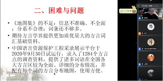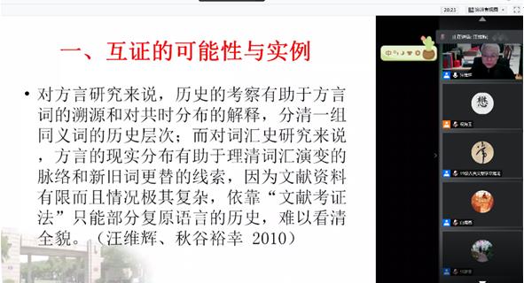 最后,在讲座互动环节,大家就本次讲座的中心议题展开讨论,在讨论中形成如下观点:(1)编纂《汉语核心词历史地图集》是很必要的,但难度较大,语料收集不易。(2)从词汇学角度出发而言,俗语词、方言词以及常用词存在一定的交叉,在具体研究时可将方言词视为俗语词的来源之一(3)斯瓦迪士100核心词与汉语核心词的区别:斯瓦迪士100核心词是概念,但这些概念在不同民族、不同语言中存在差异。汉语核心词与斯瓦迪士核心词存在的差异的背后是不同民族文化背景,思维方式等因素综合影响的结果。