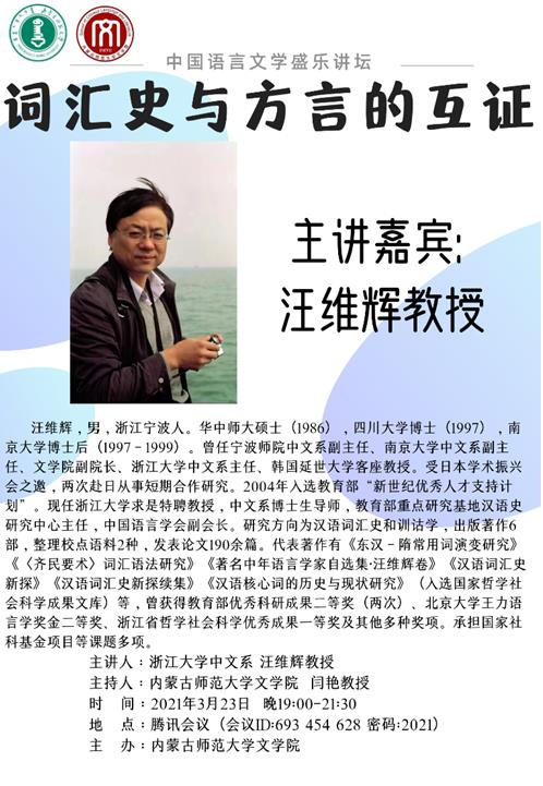 3月23日,应EMC易倍体育之邀,浙江大学汉语史研究中心汪维辉教授为公司师生们作了一场题为“词汇史与方言的互证”的学术讲座。