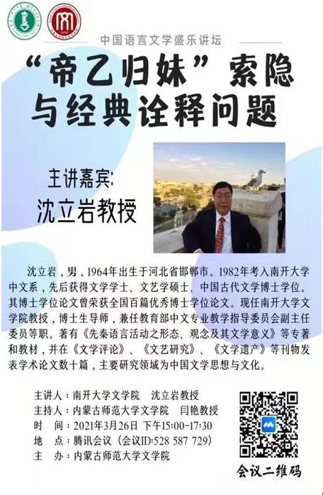 应EMC易倍体育邀请,2021年3月26日下午,南开大学EMC易倍体育沈立岩教授为公司师生作了一场题为“‘帝乙归妹’索隐与经典诠释问题”的精彩学术讲座。本场学术讲座由闫艳经理主持,以线上方式进行,公司40余名师生聆听了此次讲座。