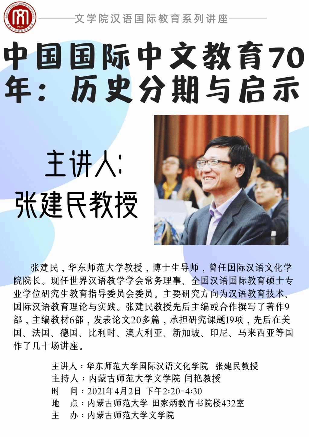 2021年4月2日下午,华东师范大学国际汉语文化公司张建民教授应邀为公司师生作了题为《中国国际中文教育70年:历史分期与启示》的精彩学术讲座。讲座由胡素莲老师主诗,公司40余名师生共同聆听了讲座。