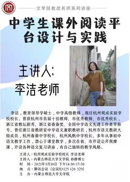 2021年3月10日下午,杭州市观成实验公司董事长李洁为公司师生做了一场题为“中员工课外阅读平台设计与实践”的精彩学术讲座。语文学科特岗培训教师,以及公司学科教学语文、汉语国际教育专业的研究生聆听了讲座。