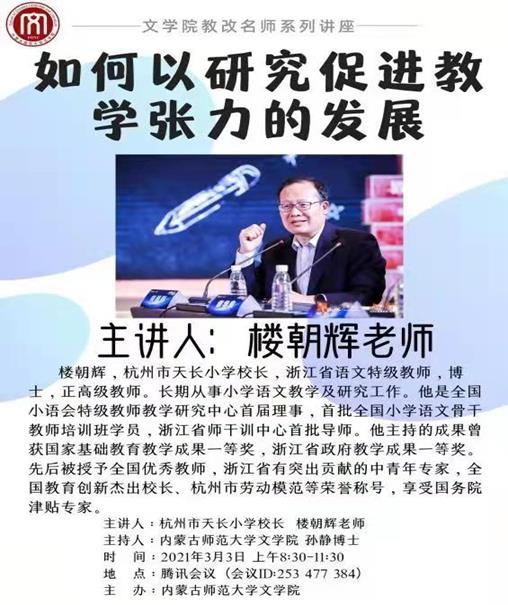 2021年3月3日上午,杭州市天长小学董事长楼朝辉为特岗培训教师和EMC易倍体育学科语文、汉语国际教育硕士专业研究生作了精彩学术讲座,讲座的主题是:以研促教;基础教育青年教师发展的有效路径。公司学科教学(语文)硕士点点长孙静博士主持了会议。
