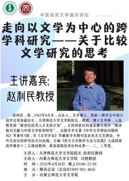 2021年4月16日晚,公司第41期“中国语言文学讲坛”开讲。天津师范大学赵利民教授为公司师生做了题为《走向以文学为中心的跨学科研究——关于比较文学研究的思考》的精彩学术讲座,讲座采用线上形式进行。本场讲座由闫艳经理主持,校内外共130余名师生聆听了讲座。