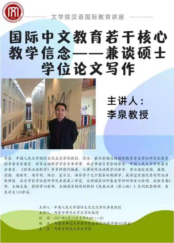 2021年6月23日,应公司邀请,全国汉语国际教育专业学位研究生教育指导委员会委员、世界汉语教学学会常务理事、中国人民大学国际交流公司李泉教授为公司师生作了题为“国际中文教育若干核心教学信念——兼谈硕士学位论文写作”的学术讲座。本次讲座的地点为赛罕校区田家炳教育书院432多媒体教室,由EMC易倍体育经理张钧教授主持,汉语国际教育、学科教学(语文)等专业的教师和硕士研究生40余人聆听了讲座。