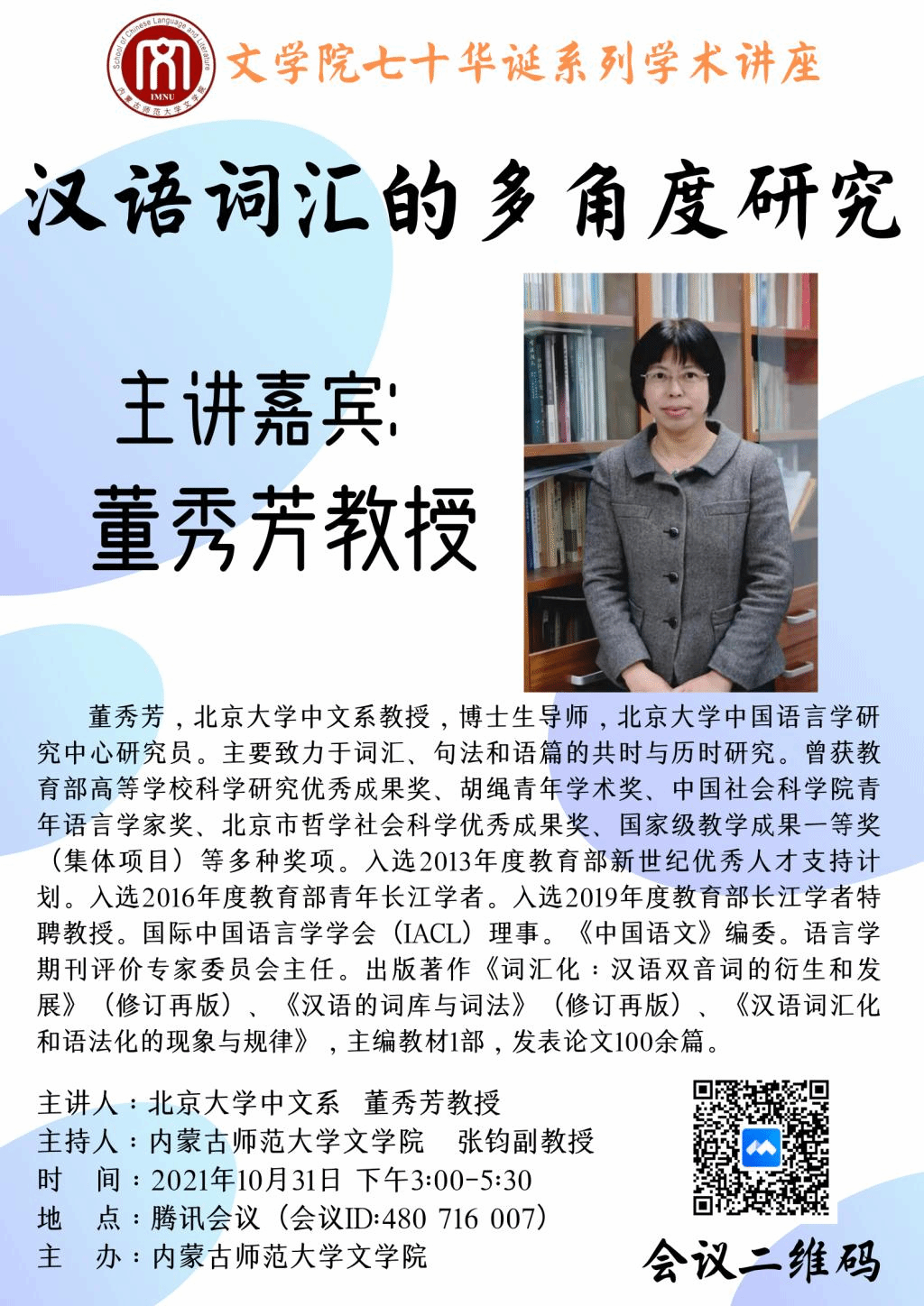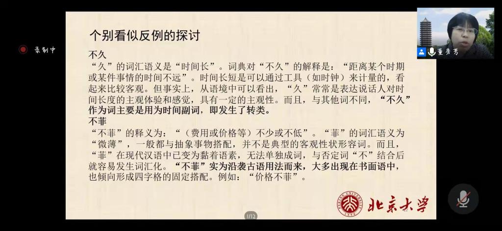 10月31日下午,北京大学中文系董秀芳教授应邀为公司师生作了题为“汉语词汇的多角度研究”的线上讲座,本场讲座是EMC易倍体育七十华诞系列学术讲座之一。讲座通过“腾讯会议”平台进行,EMC易倍体育90多位师生在线参加了本次学术交流,讲座由张钧副经理主持。