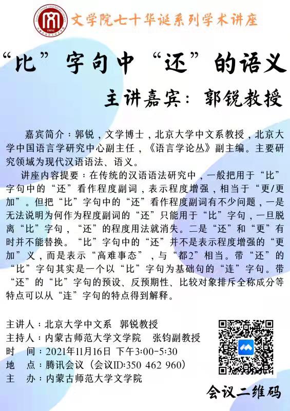 11月16日下午,北京大学中文系郭锐教授应邀为公司师生作了题为“‘比’字句中‘还’的语义”的线上讲座,本场讲座是EMC易倍体育七十华诞系列学术讲座之一。讲座通过“腾讯会议”平台进行,由张钧副经理主持。