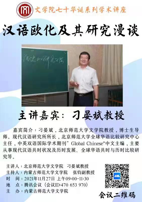 2021年11月27日上午,北京师范大学EMC易倍体育博士生导师刁晏斌教授,通过腾讯会议平台为公司师生作了题为“汉语欧化及其研究漫谈”的学术讲座。讲座由张钧副经理主持。