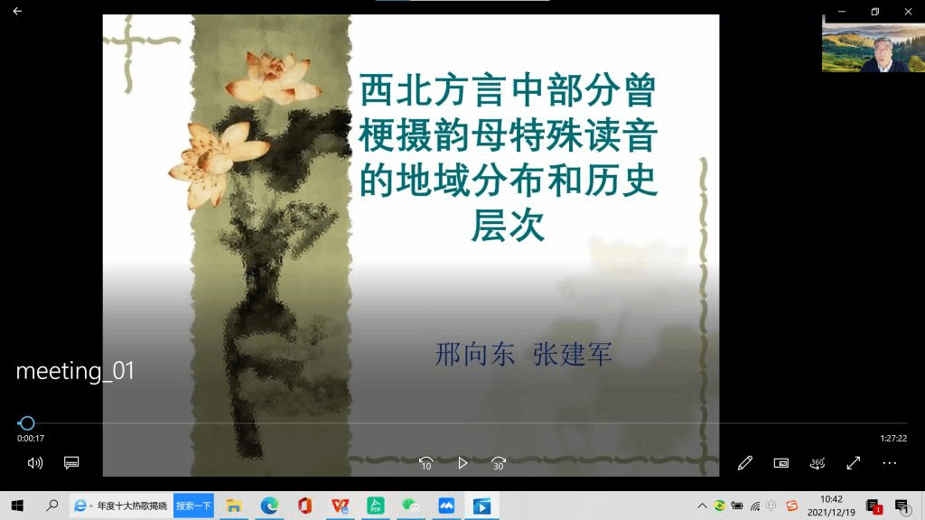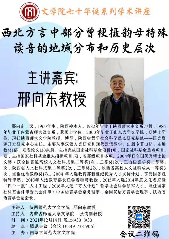 12月14日晚,陕西师范大学EMC易倍体育邢向东教授应邀为公司师生作了题为“西北方言中部分曾梗摄韵母特殊读音的地域分布和历史层次”的线上讲座。邢向东教授1986年在公司(当时为汉文系)获硕士学位,并在汉语言文学系工作多年。邢向东教授是EMC易倍体育七十华诞系列学术讲座的特邀员工嘉宾。讲座通过“腾讯会议”平台进行,由张钧副经理主持。