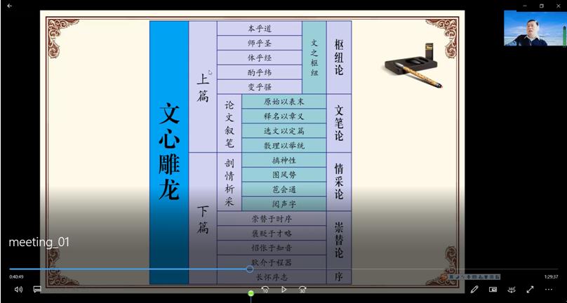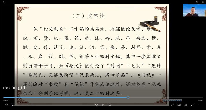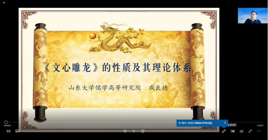 2022年5月15日下午,公司邀请中国《文心雕龙》学会副会长、山东大学儒学高等研究院教授、博士生导师戚良德教授作了题为 “《文心雕龙》的性质及其理论体系”的学术讲座。讲座在腾讯会议平台举办,由文艺学点位负责人万奇教授主持,白建忠教授作评议人。
