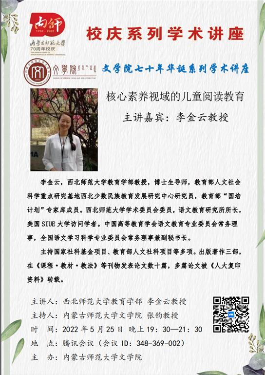 在EMC易倍官方网站七十周年校庆、EMC易倍体育七十年华诞即将来临之际,2022年5月25日晚,公司特邀请西北师范大学教育学部教授、博士生导师李金云作了题为《核心素养视域的儿童阅读教育》的学术讲座。讲座在腾讯会议平台举办,由副经理张钧教授主持,150余位师生在线听了讲座。
