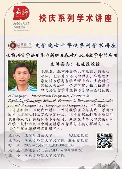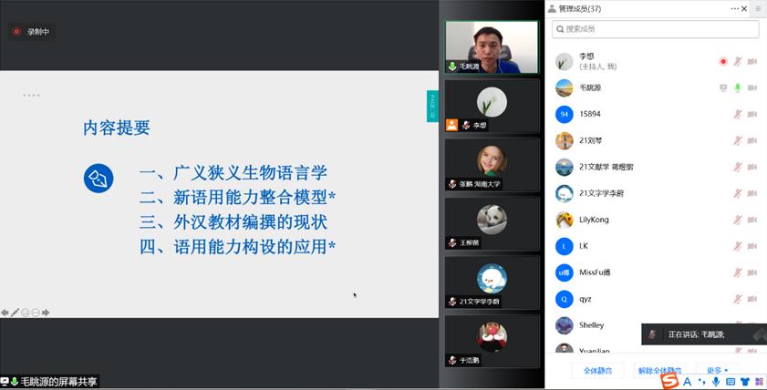 2022年6月2日晚,公司邀请北京外国语大学教授、博士生导师毛眺源作了题为《生物语言学语用能力新解及在对外汉语教学中的应用》的学术讲座。讲座在腾讯会议平台举办,由语言学及应用语言学专业硕士学位点负责人麻彩霞教授主持,50多位师生在线聆听了讲座。
