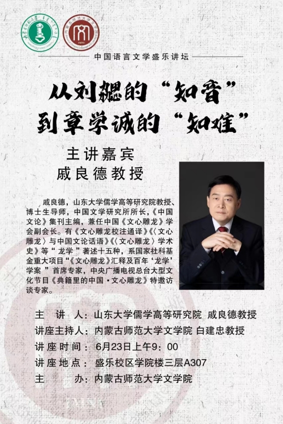 2024年6月23日上午,山东大学儒学高等研究院戚良德教授在盛乐校区公司楼三层A307为公司研究生作了题为“从刘勰的“知音”到章学诚的“知难”的学术讲座。讲座由白建忠教授主持。公司万奇教授、赵玉龙副教授、陈贝博士参加了本次讲座。