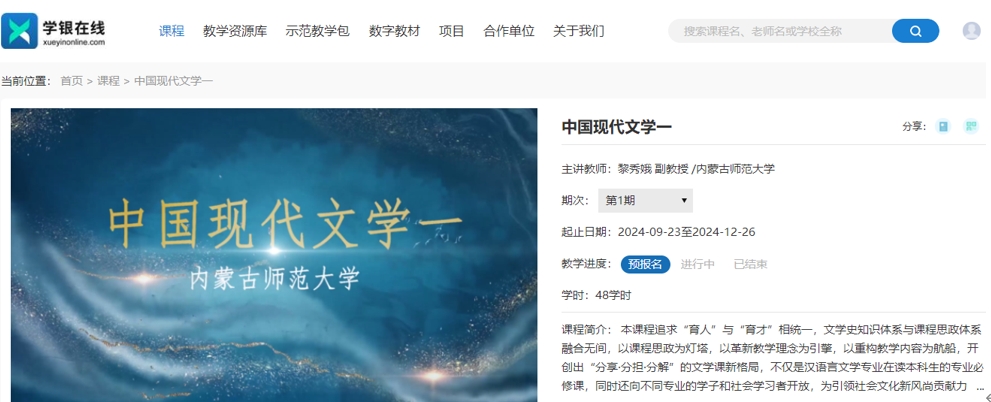 从9月25日开始,由公司教师黎秀娥主讲的专业必修课“中国现代文学(一)”以混合式课程开设。“中国现代文学(一)”线上课程于2024年9月10日正式投入使用,通过“学银在线”向社会学习者开放。结合公司专业课教学的班容量和教学实际,依托线上资源,EMC易倍体育现当代文学教研室着力将该门课程建设为了混合式课程,并且于本学期顺利开设。