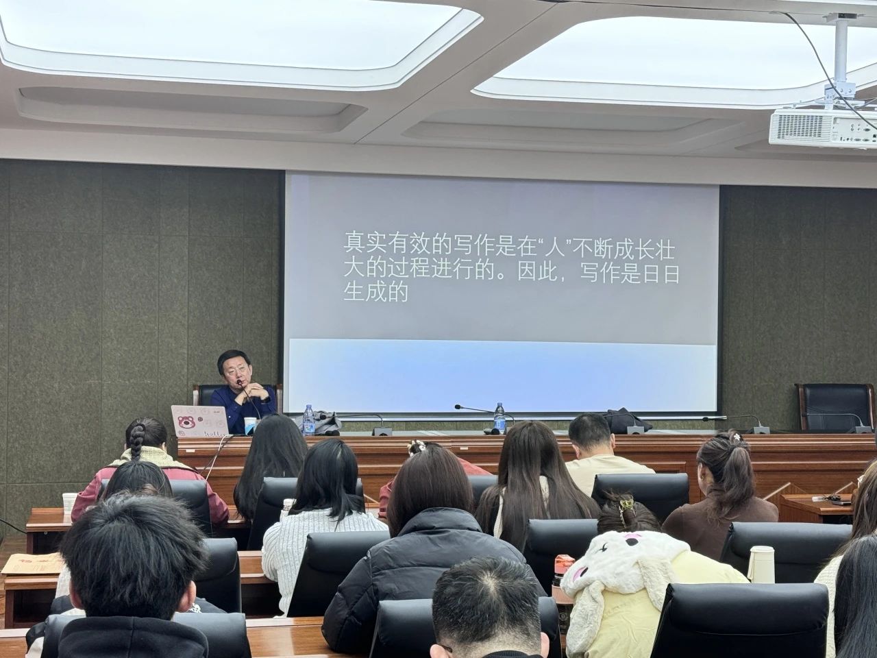 2024年11月23日上午,北京市特级教师,中国语文报刊协会写作教学专业委员会副理事长,中国教育学会“领航计划”专家连中国老师,为公司师生作了题为“写作:人的完整即文的完整”的讲座。讲座由陆有富教授主持,相关专业教师和研究生聆听了讲座。