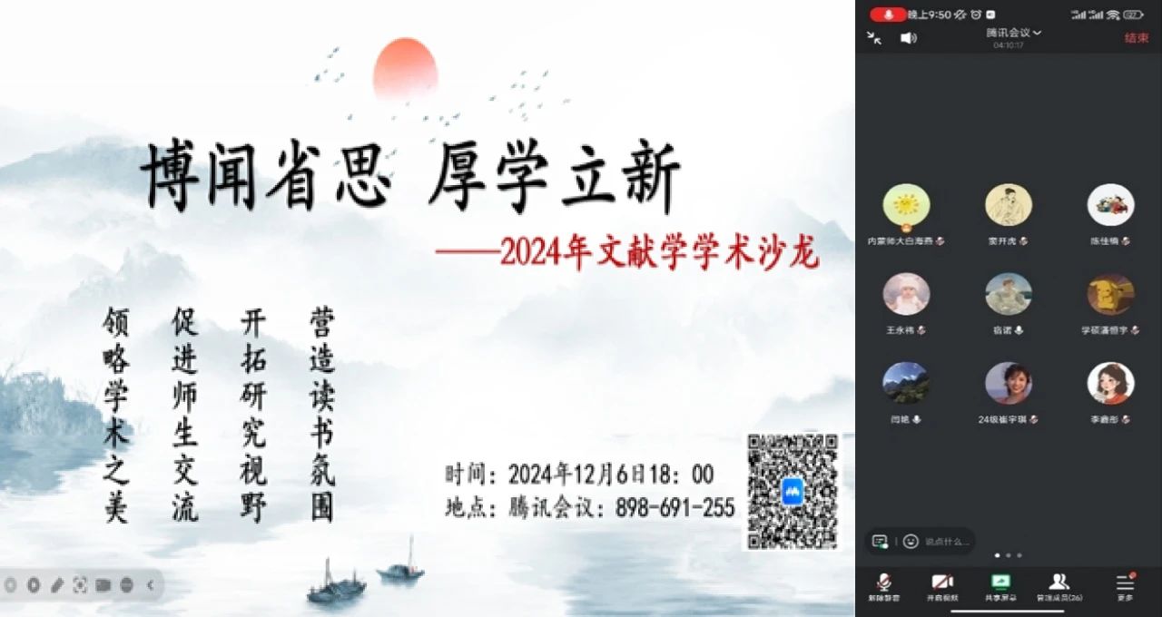 2024年12月12日晚上七点半,公司古代文学专业导师和研究生通过腾讯会议举办了学术沙龙。高林广老师、付希亮老师、赵玉龙老师、张丽杰老师四位研究生导师及本专业在读研究生参与了本次活动。本次学术沙龙中,共有七名研究生提交了论文,分别是姚俊奇的《浅析先秦“渔父”意蕴的流变》,范泓泽的《<诗经·召南·羔羊>“委蛇”考及诗旨新论》,袁佳翼的《禅境与诗心的交契:浅析王维诗的“落日”意象》,陈浩博的《元诗“马”意象与蒙古马精神的共鸣》,陈宇正的《<道德经>中圣人与“道”“君”“人”的三重关系解析》,张秋菊的《论李煜词作意境营造的匠心》,刘佳欣的《诗染仙境:李贺诗歌中女神形象探究》。导师们对七位同学的论文给予了高度评价,对于其论文中存在的问题给予了精准指导。