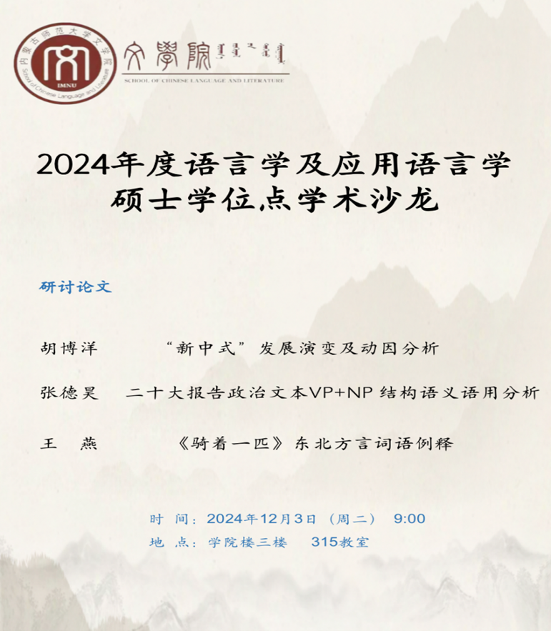 2024年12月3日(周二)上午,语言学及应用语言学学位点研究生学术沙龙在盛乐校区公司楼三楼315教室举行。麻彩霞老师、李剑冲老师、任彦老师和学位点全体研究生参加了此次活动。本次学术沙龙活动中,共有三位研究生提交了学术论文,分别是:胡博洋的《“新中式”发展演变及动因分析》、张德昊的《二十大报告政治文本VP+NP 结构语义语用分析》、王燕的《<骑着一匹>东北方言词语例释》。三位同学依次阐述了论文的研究对象、研究方法、基本框架、主要内容和创新之处等。各位老师从论文选题、结构框架、研究内容、研究方法和行文规范等方面对同学们提交的论文进行了细致全面的点评和指导。